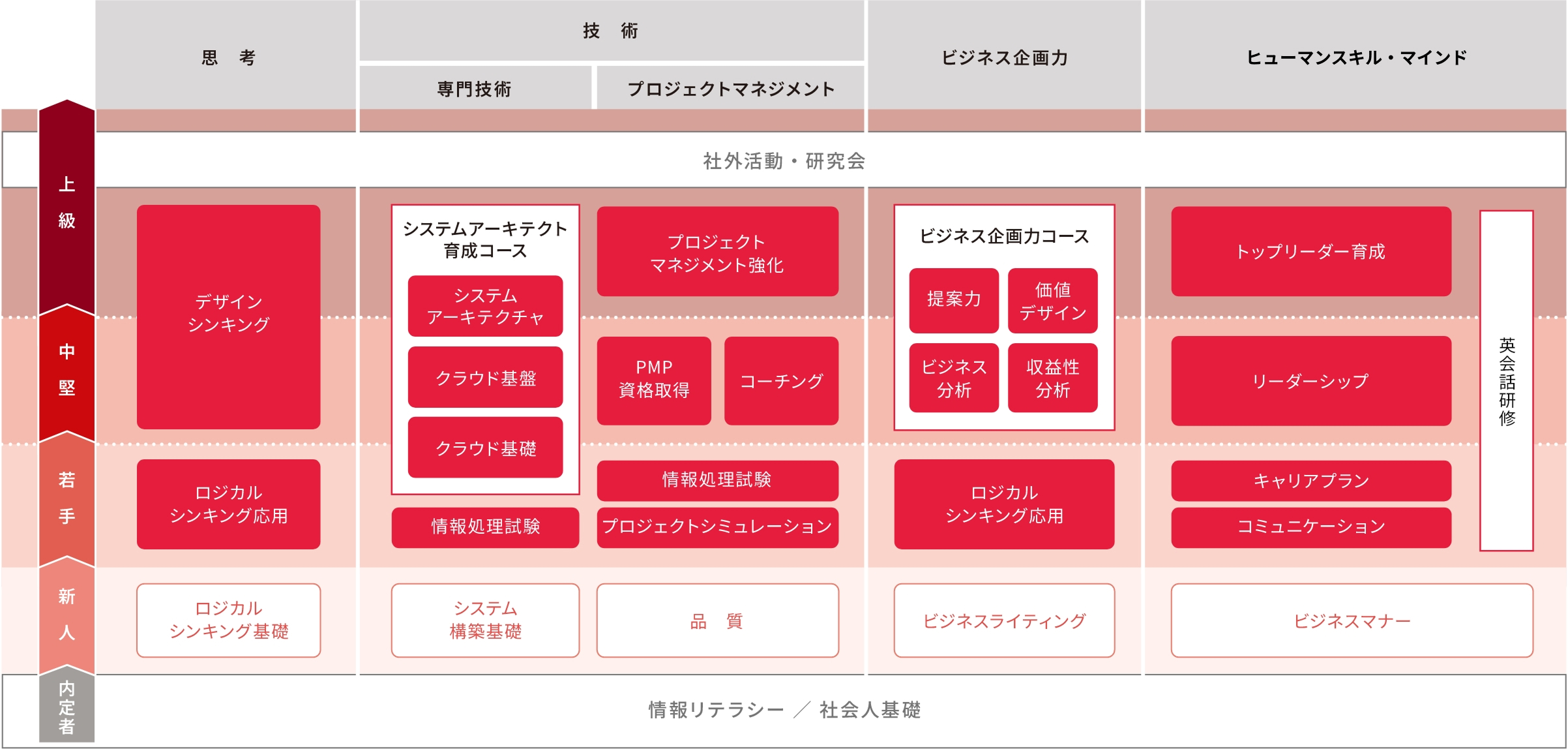ビジネスマナー/コミュニケーション/ビジネスライティング/プレゼンテーション技法/ストラテジー/ロジカルシンキングなど